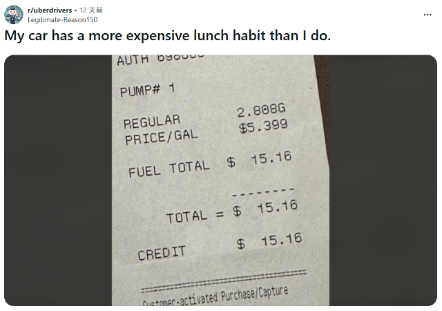 还有一位司机晒出了自己的小票,配文:“我的车吃午饭比我贵。”