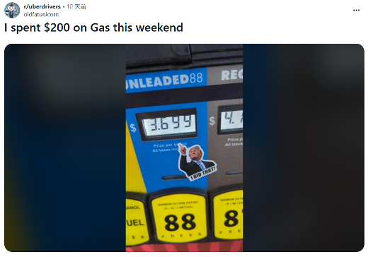 一位网约车司机吐槽自己周末加油花了200美元。他晒出了加油站的燃油价格,并在价格下面贴了一张特朗普贴纸,上面写着:“这是我干的。”