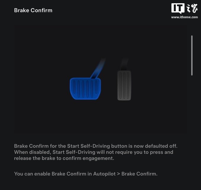 IT之家注意到,官方在发布说明中明确指出:“‘启动自动驾驶’按钮的刹车确认功能现已默认关闭。当此功能禁用后,启动自动驾驶将不再需要您踩下并释放刹车踏板以确认启用。您可在‘自动辅助驾驶 > 刹车确认’设置中重新开启该功能。”